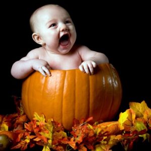 Even if babies are too young to actually do the pumpkin carving, they can still be present as it is going on. The baby can be sat on the floor with newspapers next to the pumpkin while adults are carving it.